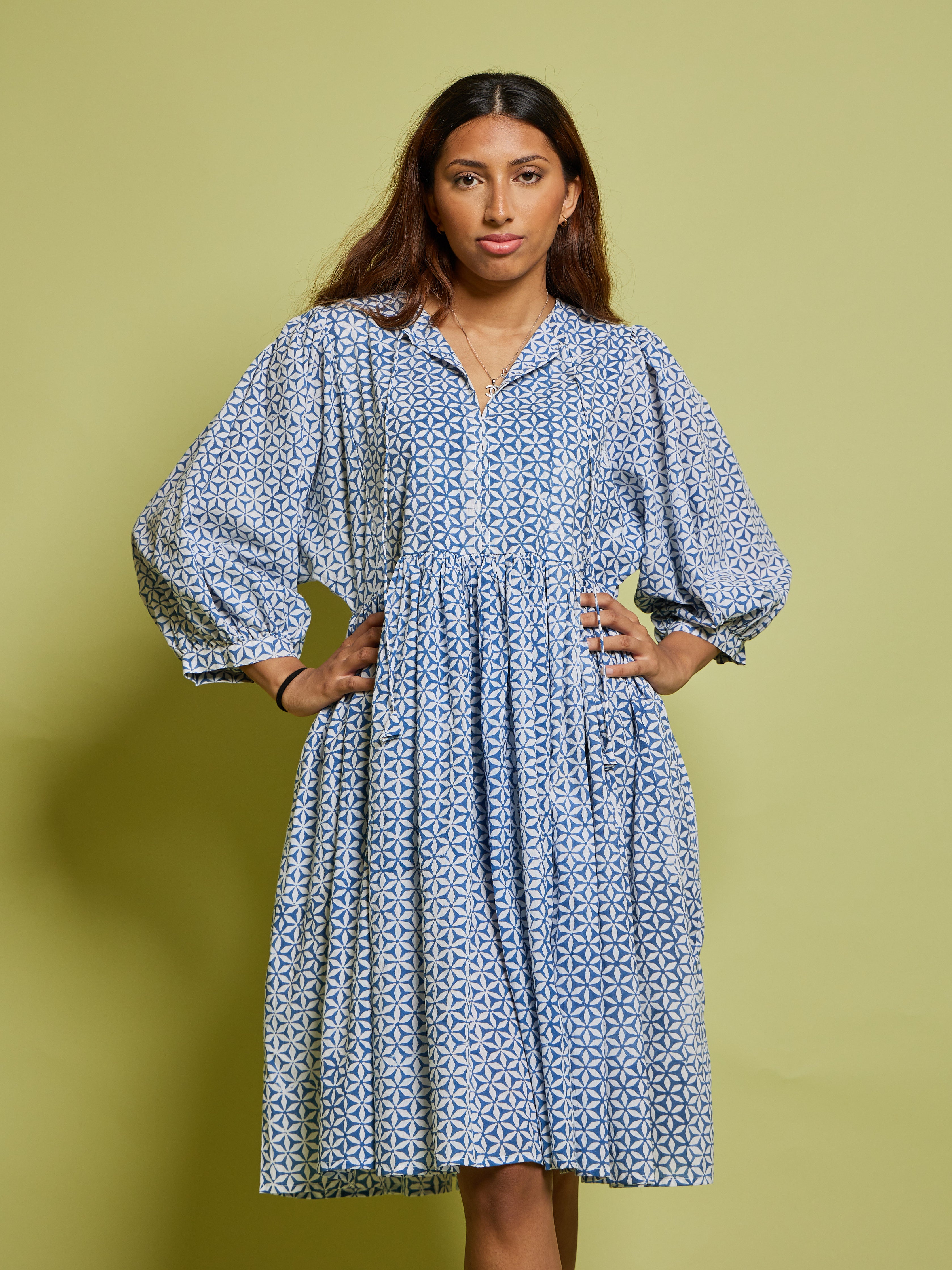 Embrace a new adventure with the TRANQUIL SHORT DRESS - perfect for tropical getaways and laid-back vacations. Made with 100% cotton, this dress features billowy sleeves, a back tie, and functional pockets. Embody a bold and daring attitude while dancing in this ethereal dress adorned with a captivating hot blue and white geometric pattern. Are you brave enough to rock this flawless summer color?